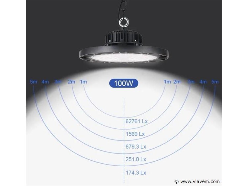 8 x Highbay UFO 100 Watt LED in PRO-ontwerp biedt hoge efficiëntie met 12.000 lumen bij 100 lumen per watt - Uitgerust met Professioneel LED voor superieure helderheid en betrouwbaarheid - Dimbaar met een schakelaar die 3 verschillende standen biedt: 60%/80%/100% vermogen - Aangedreven door een hoogwaardige Lifud-driver. die stabiele prestaties garandeert - Koud wit licht bij 6500K voor heldere. duidelijke verlichting - Waterdicht met een IP65-classificatie. ideaal voor zowel binnen- als buitengebruik - Afmetingen: Ø 260mm x 102mm voor eenvoudige installatie - Duurzame constructie van gegoten aluminium met een PC-lens. met een levensduur van 30.000 uur - 90° stralingshoek voor brede lichtdekking - Energiezuinig met een power factor 0.95 - Hoge CRI 80 voor nauwkeurige kleurweergave - Compatibel met 110-265V - Geleverd met 5 jaar garantie voor gemoedsrust - Weinig onderhoud door de lange levensduur - Efficiënte warmteafvoer voorkomt oververhitting - Milieuvriendelijk en kosteneffectief. verlaagt de energierekening - Biedt flikkervrij. stabiel licht.