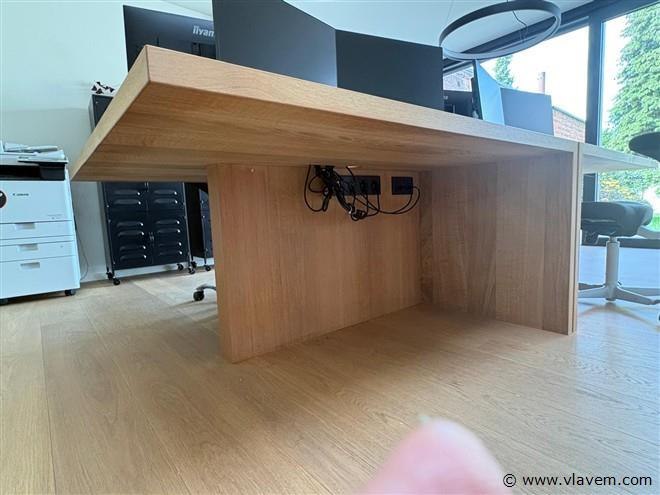 Modern houten bureau met uitgesneden kabelgoot voor snoeren en ingebouwde stopcontacten en aansluitingen, 2 plaatsen 148 x 148 cm