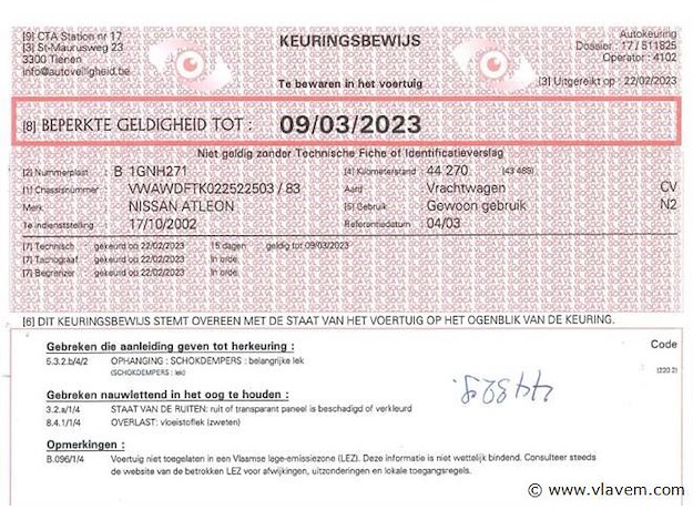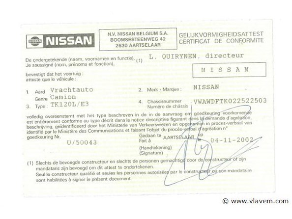 Vv. laadbrug, fabr. NISSAN, model ATLEON 165/TK120L/53, eerste inschrijving 2002, km-stand plm. 44.329, diesel, chassisnr. VVAWDFTK022522503, alle doc. en sleutel aanwezig. Keuring vervallen.