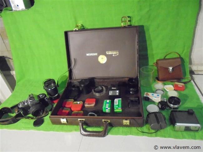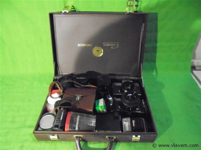 Foto toestel in koffer met tal van onderdelen en telelenzen+ een extra toestel voor reparaties incl, lederen koffer