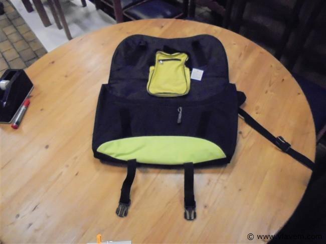 Stevige draagtas nieuw voor rug/fiets enz goed voor laptop/boeken met 2ritssluitingen binnen kant en buitenkant zeer stevig en fluo incl koeltasje voor blikjes 50cm breed en 35cm hoog