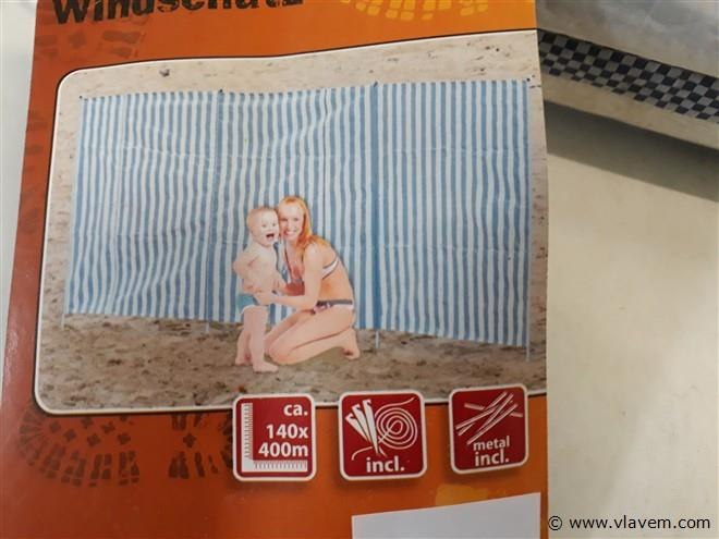 1 x Windscherm pvc doek wit/blauw H 140 x L 400 cm met metalen palen en bevestigingstouw