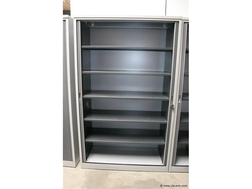 Volledig in metaal kleur alu, rolluiken in kunststof kleur antraciet, uitgerust met 4 legplanken, afm. 1980 x 1200 x 470 mm (h x b x d), in goede staat enkel wat verkleuring door UV inwerking; foto's indicatief