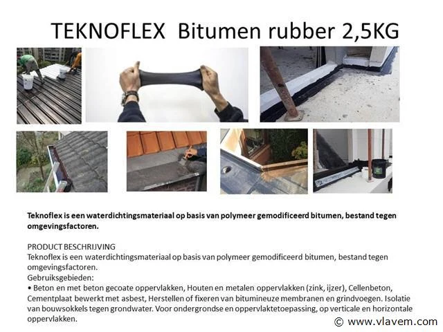10 stuks, Teknoflex Liquid Membrane 2.5kg. PRODUCT BESCHRIJVING Teknoflex is een waterdichtingsmateriaal op basis van polymeer gemodificeerd bitumen, bestand tegen omgevingsfactoren. Gebruiksgebieden: • Beton en met beton gecoate oppervlakken, Houten en metalen oppervlakken (zink, ijzer), Cellenbeton, Cementplaat bewerkt met asbest, Herstellen of fixeren van bitumineuze membranen en grindvoegen. Isolatie van bouwsokkels tegen grondwater. Voor ondergrondse en oppervlaktetoepassing, op verticale en horizontale oppervlakken.