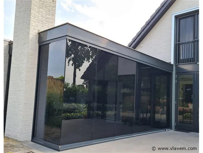 Schuifdeursysteem voor aanbouw, overkapping, veranda of tuinkamer, Compleet set met 3 stuks glasdeuren van 1030 mm en boven- en onderrail, verstelbare glasprofielen, glasopvang-tochtprofielen en twee grepen 2000mm hoog ( min 1970 en max 2010 mm) breedte 3030 mm, breedte inkortbaar, kleur Mat zwart RAL 9005, Dit product wordt gratis thuisgeleverd ( 1 persoon moet helpen lossen)