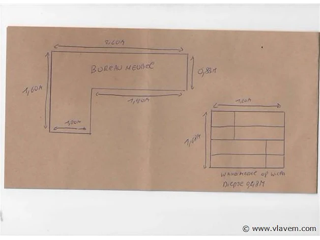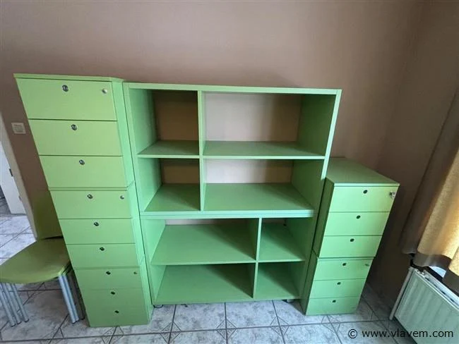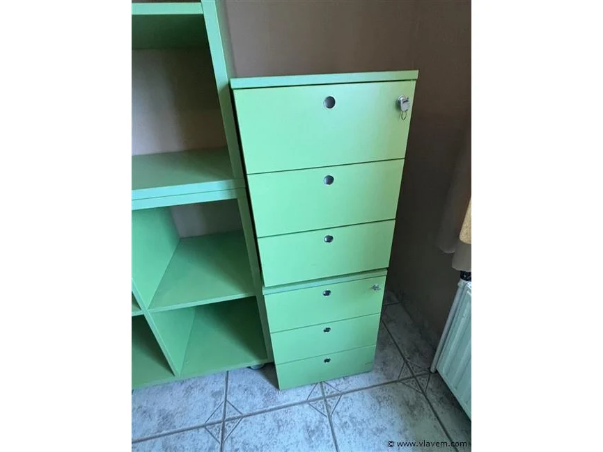 1 bureau, 5 ladeblokken, 1 wandmeubel en stoelen