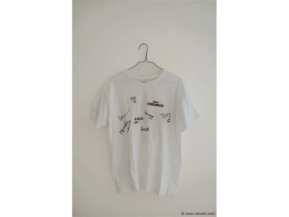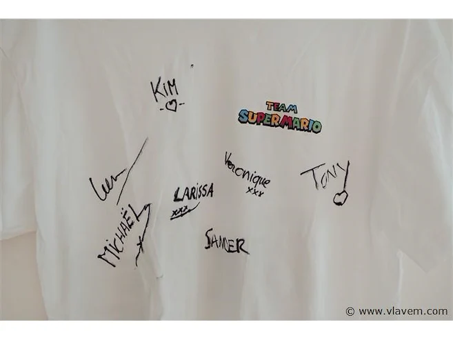 Team SuperMario shirt. Radio Nostalgie DJ's, Veronique De Kock, Sander Vandenhende, Tony Talboom, Michaël Joossens, Larissa Roose, Leen Demaré, Kim.