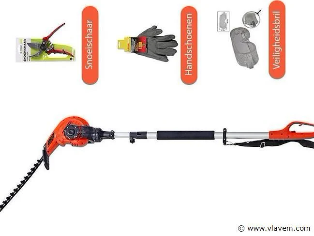 Kibani Elektrische Heggenschaar XXL - Incl. snoeischaar, beschermbril & handschoen – 450W – 49 cm Zwaardlengte – Telescopisch, verstelbare hoogte van 190 tot 250 cm is de telescopische heggenschaar geschikt voor heggen van elk formaat. Ook is de kop naar wens instelbaar, in een werkhoek van -60° tot +80°.