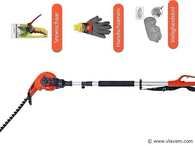 Kibani Elektrische Heggenschaar XXL - Incl. snoeischaar, beschermbril & handschoen – 450W – 49 cm Zwaardlengte – Telescopisch, verstelbare hoogte van 190 tot 250 cm is de telescopische heggenschaar geschikt voor heggen van elk formaat. Ook is de kop naar wens instelbaar, in een werkhoek van -60° tot +80°.