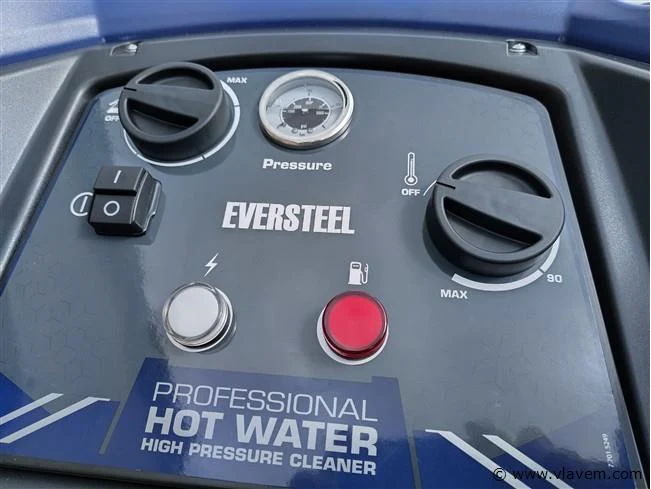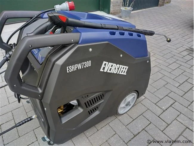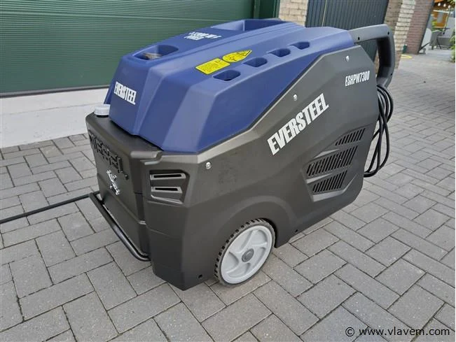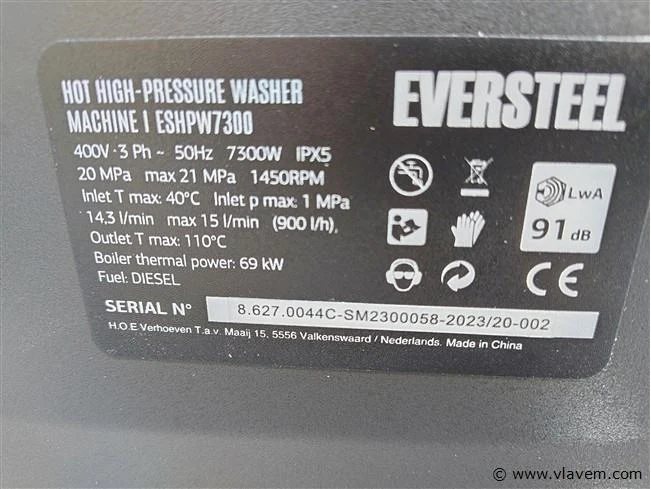 Diesel hogedruk stoomreiniger professioneel, incl. 10 meter hogedrukslang en spuitlans, vloeistof aanzuiging voor reinigingsproducten, waterfilter, dieseltank voor verwarming 10 liter inhoud, 2 zwenkwielen en 2x vaste wielen, 5 polig 16 Amp industriestekker 380 volt, 7300 watt, 69 KW verwarming vermogen. tot 110 graden. nieuw in krat
