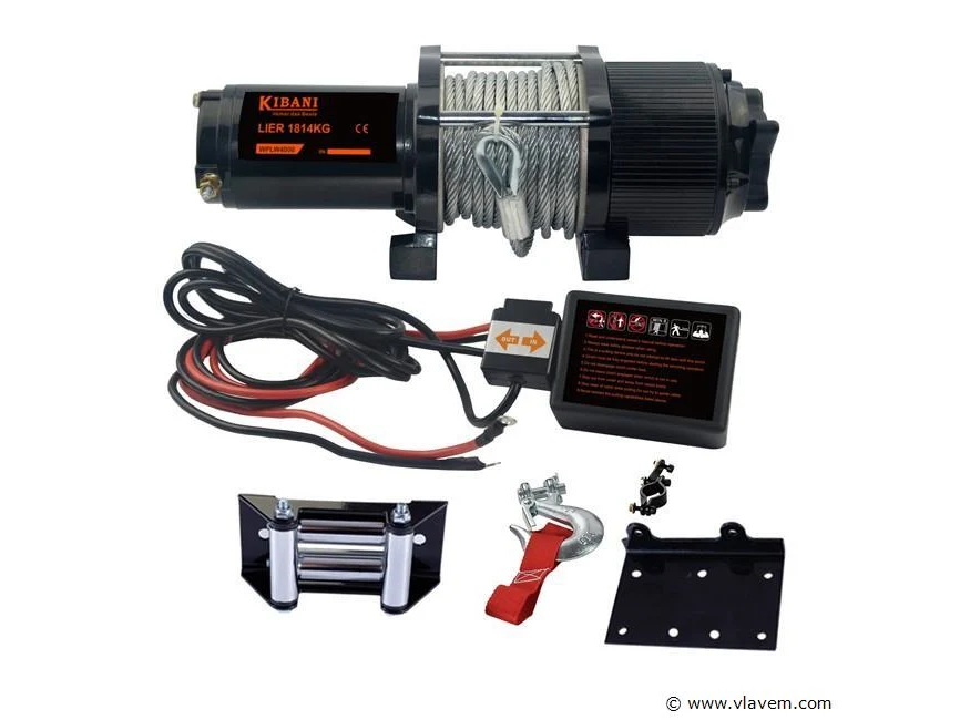Elektrische lier 12 volt 1814kg, Gewicht 14 kg, Afmetingen 35.4 × 11.7 × 12.3 cm Aandrijving elektrisch, Voedingsspanning 12 V, Vermogen 0.9 kW, verbrengingsverhouding 128.2:1, Diameter Kabel 6 mm, Trekkracht 1814kg (4000lbs), Onbelaste kabelsnelheid 6.7 m/min, Max. belaste kabelsnelheid 1.7 m/min, Lengte Kabel 13.5 meter, Keurmerken CE, Model WPLW4000