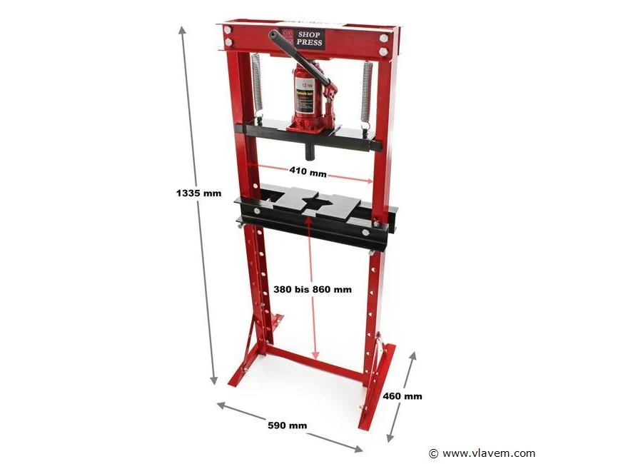 Persdruk 12t • Hefcilinder 136 mm • Afmetingen: 133 x 51 x 56 cm • Minimale hefhoogte: 50 mm • Maximale hefhoogte: 680 mm