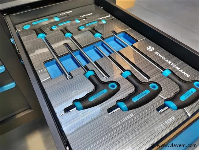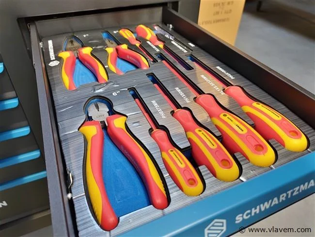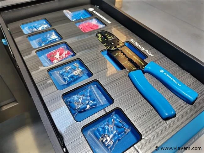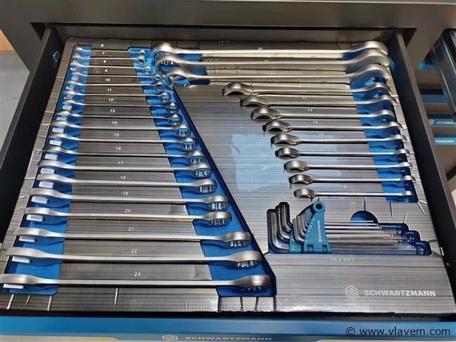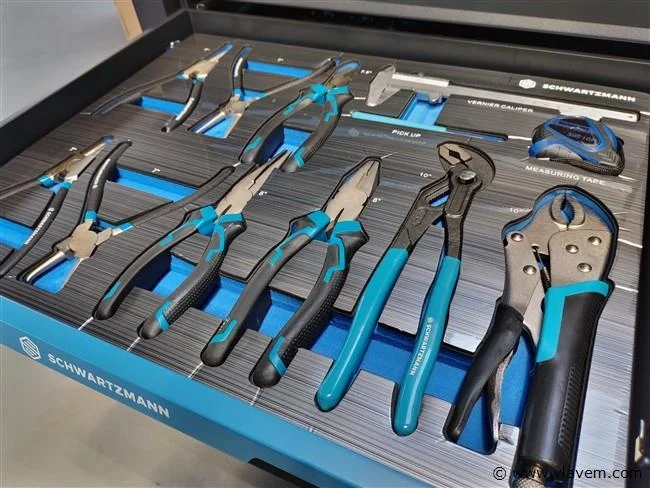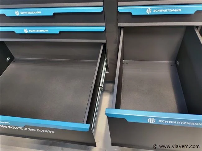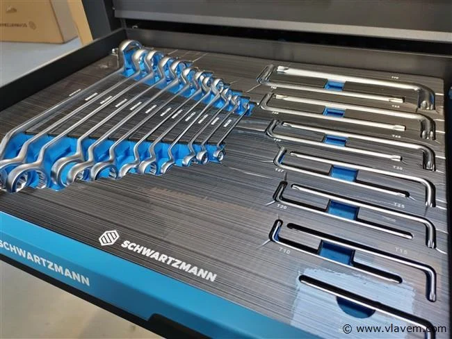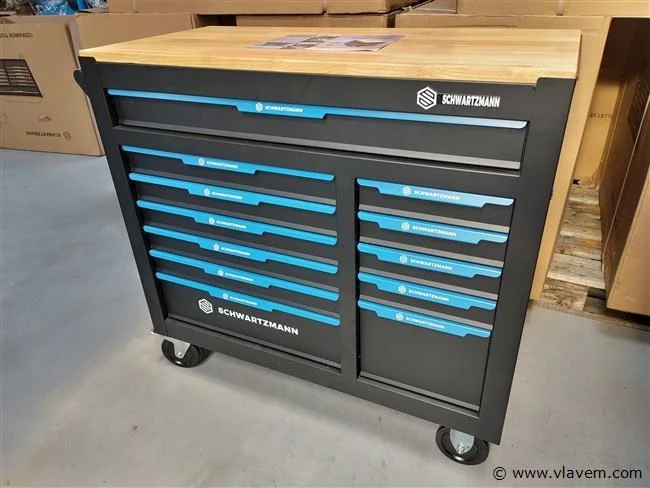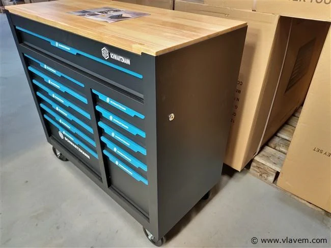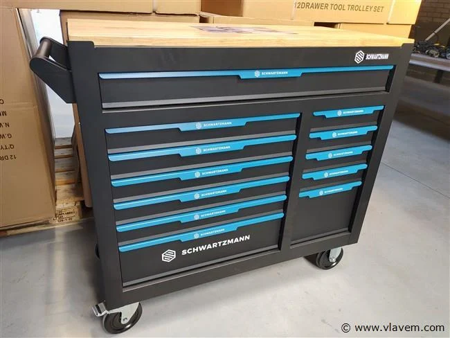 Unieke grote gereedschapswagen met 12 laden waarvan 10 laden gevuld met kwaliteits gereedschap, degelijke wagen met lades en wielen lopend op kogellagers, Houten bovenblad voor gebruik als werkbank, 1 meter breed,gewicht ca 120 kg, nieuw in doos