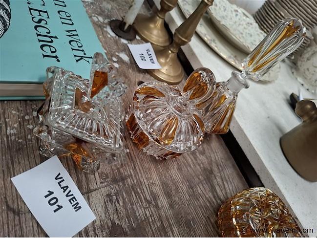 Prachtig antiek parfumsetje in amberkleurig glas vermoedelijk VAL SAINT LAMBERT