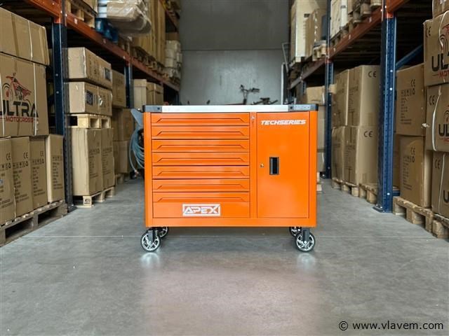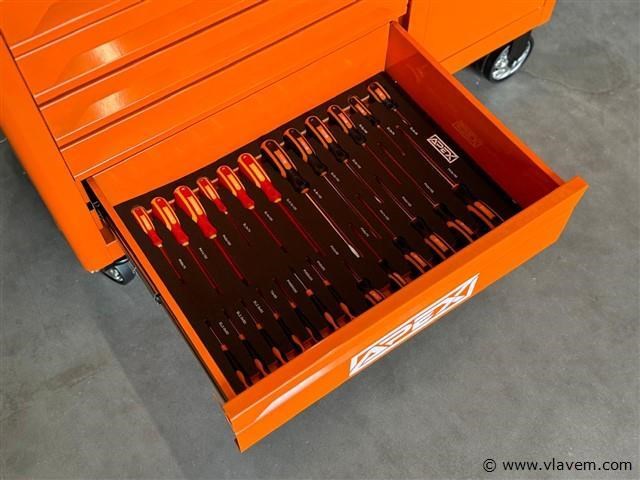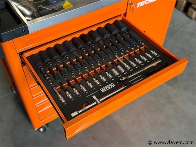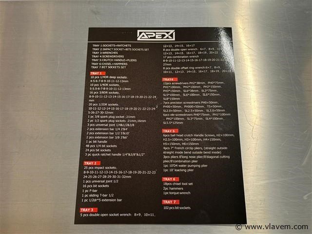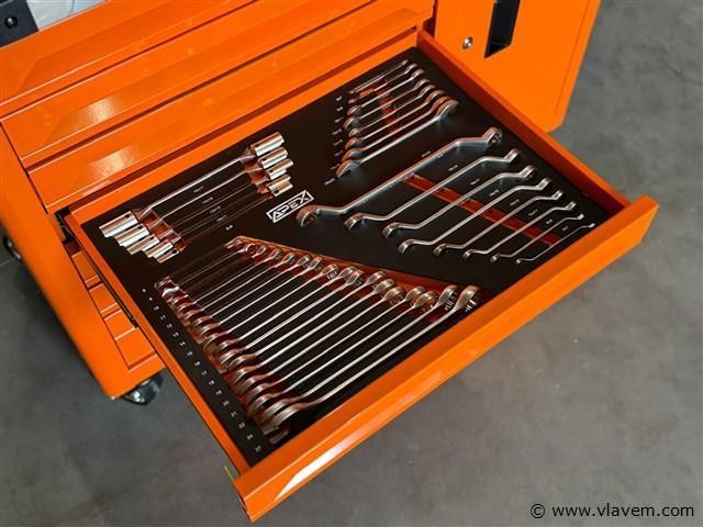 Afmetingen LxBxH: 110x45x88 cm Lengte zonder handgreep: 103 cm Hoogte zonder wieltjes: 72 cm Inhoud Lade 1: Steekdoppen + Ratstels Lade 2: Impact Steekdoppen + Bit Steekdoppenset Lade 3: Sleutels Lade 4: Schroevendraaiers Lade 5: Kruishoofd Schroefdraaiers + Tang Lade 6: Beitel + Hamers Lade 7: Bit Steekdoppenset Lade 1: Steekdoppen en Ratstels 10 stuks 1/4DR diepe steekdoppen: 4-5-6-7-8-9-10-11-12-13 mm 10 stuks 1/4DR steekdoppen: 5-5.5-6-7-8-9-10-11-12-13 mm 16 stuks 3/8DR steekdoppen: 8-9-10-11-12-13-14-15-16-17-18-19-20-21-22-24 mm 20 stuks 1/2DR steekdoppen: 10-11-12-13-14-15-16-17-18-19-20-21-22-23-24-25-26-27-30-32 mm 1 stuk 3/8 bougie steekdoppen: 21 mm 2 stuks 1/2 bougie steekdoppen: 21 mm, 16 mm 3 stuks universele gewricht 1/4 & 1/2 & 3/8 2 stuks verlengstang 1/4 2' & 4' 2 stuks verlengstang 1/2 5' & 10' 2 stuks verlengstang 3/8 3' & 6' 1 stuk bit houder 48 stuks 1/4 bit steekdoppen 24 stuks bit steekdoppen 3 stuks snelle ratstelhouder 1/4" & 3/8" & 1/2" Lade 2: Impact Steekdoppen en Bit Steekdoppenset 25 stuks impact steekdoppen: 8-9-10-11-12-13-14-15-16-17-18-19-20-21-22-23-24-25-26-27-28-29-30-31-32 mm 1 stuk universele gewricht 1/2 16 stuks bit steekdoppen 1 stuk F-bar 1 stuk glijdende T-bar 1/2 1 stuk 1/2dr*5 verlengstang Lade 3: Sleutels 5 stuks dubbele open sleutel: 8×9, 10×11, 12×13, 14×15, 16×17 8 stuks dubbele open sleutel: 6×7, 8×9, 10×11, 12×13, 14×15, 16×17, 18×19, 20×22 17 stuks combinatie sleutel: 8-9-10-11-12-13-14-15-16-17-18-19-20-21-22-24-27 mm 8 stuks dubbele offset ringsleutel: 6×7, 8×9, 10×11, 12×13, 14×15, 16×17, 18×19, 20×22 Lade 4: Schroevendraaiers 12 stuks schroevendraaiers: PH238 mm, PH075 mm, PH3150 mm, SL638 mm, SL375 mm, SL5100 mm, SL6100 mm, SL6150 mm, PH1100 mm, PH2100 mm, PH2150 mm, SL8150 mm 7 stuks precisie schroevendraaiers: PH0x50 mm, PH00x50 mm, PH000×50 mm, T5x50 mm, SL2.0x50 mm, SL2.5×50 mm, SL3.0x50 mm 6 stuks ele-schroevendraaiers: PH075 mm, PH1100 mm, PH2100 mm, SL375 mm, SL4100 mm, SL5.5125 mm Lade 5: Kruishoofd Schroefdraaiers en Tang 6 stuks kruishoofd schroefdraaiers: H2x100 mm, H2.5x100 mm, H3x100 mm, H4x150 mm, H5x150 mm, H6x150 mm 4 stuks 7" Franse kniptang: (recht buiten recht binnen gebogen buiten gebogen binnen) 3 stuks tang: 8' lange neus tang/8' diagonale kniptang/8' combinatie tang 1 stuk 10' D4 waterpomptang 1 stuk 10' vergrendelende tang Lade 6: Beitel en Hamers 18 stuks beitel gereedschapsset 2 stuks hamers 1 stuk koppelingsmeter Lade 7: Bit Steekdoppenset 102 stuks bit steekdoppen