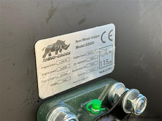 Model: GS650 Wood Chipper Engine power: 420cc; 15hp Start: Recoil and E-start Cutting method: Drum Chipping Diameter: 120mm Knives Nos.: 2 x blade; 1 x anvil Drive train: Dual V-belt Clutch: Centrifugal clutch Feeding chute: Standard Discharge chute: 360 degree rotating Emergency stop: Stop bar + button Towing: Tow bar with 2' coupler Wheel: 16*8.0-7 tubeless tyre Weight (N.W./G.W.): 188/214 kg Package Method: Plywood Case Packing Size: 900*770*1230mm