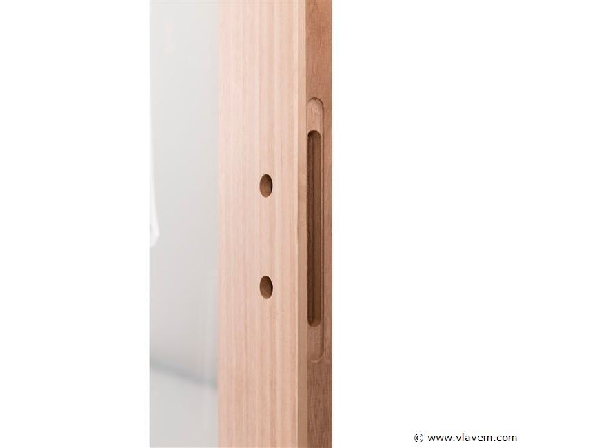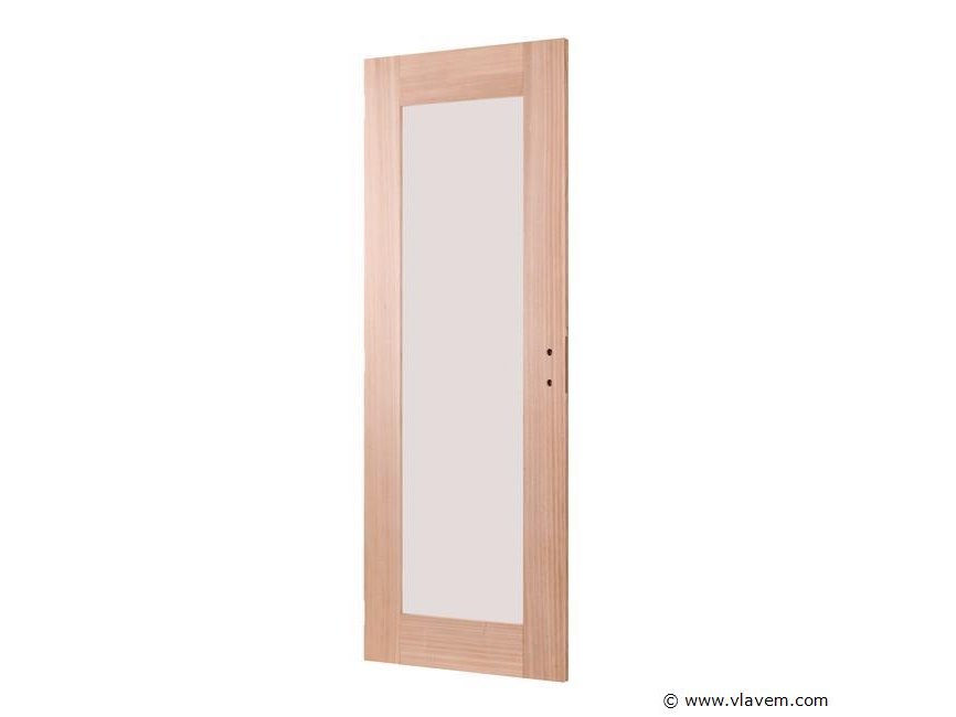 : zonder kozijnset, in massief hout, beglaasd in mat glas. Te combineren met een bestaand kozijn of nieuw kozijn. Deur reeds voorzien van frezingen voor slot en scharnieren. Afm. 40 X 730 X 2015 mm.