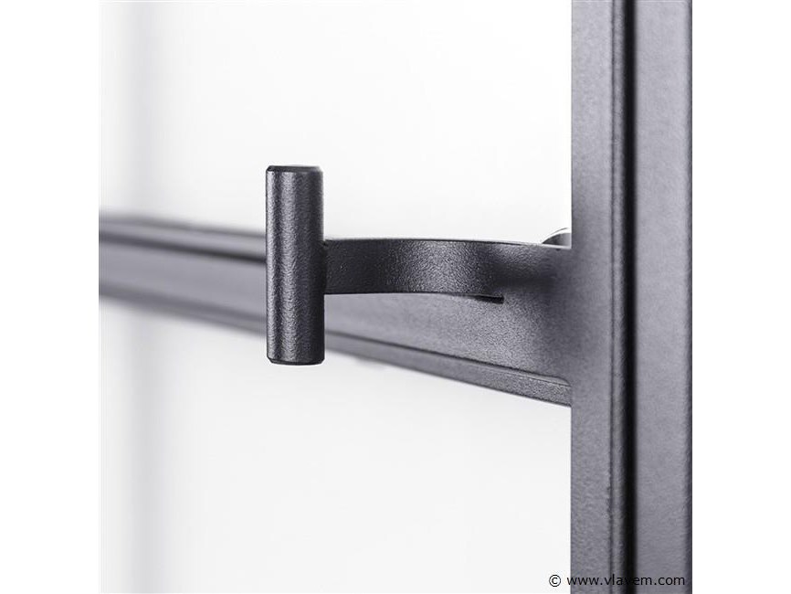 Stalen deur in zwarte poederlak met helder glaspartijen. De deur is opgebouwd met een zwart gepoederlakt paneel en daarboven een 6-glasverdeling. Omwille van een magnetische strip over de volledige lengte van de deur, is geen slotmechanisme nodig en sluit de deur gemakkelijk tegen de magneet op de aanslag. De kleine elegante trekker zorgt ervoor dat je de deur makkelijk kan openen en sluiten. De afmeting van de deur is 50mm(D) x 880mm(B) x 2140mm(H), Deze is rechtsdraaiend (Belgische norm)