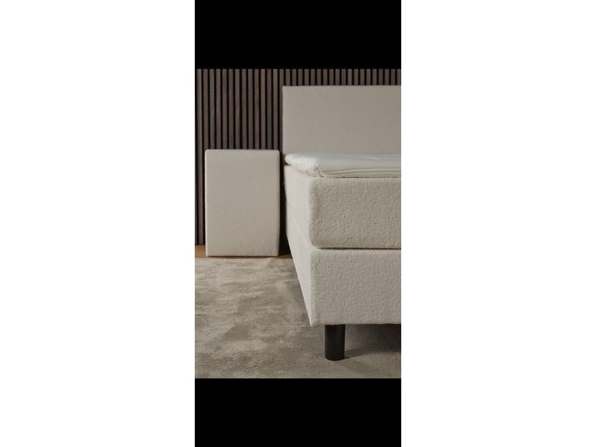 Vlakke boxspring Teddy, afmeting 160 x 200 Teddystof wit, het hoofdbord is even breed als het bed, de onderboxen zijn hard, de matras bestaat bij de 1401 cm uit 1 stuks en bij de 160 en 180 uit 2 stuks, het matra is &zone pocket geveerd. De topper is ca 5 cm dik en is van het materiaal comtort schuim, de pootjes zijn zwart rond en 12 cm hoog.