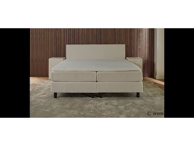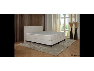 Vlakke boxspring Teddy, afmeting 180 x 200 Teddystof wit, het hoofdbord is even breed als het bed, de onderboxen zijn hard, de matras bestaat bij de 1401 cm uit 1 stuks en bij de 160 en 180 uit 2 stuks, het matra is &zone pocket geveerd. De topper is ca 5 cm dik en is van het materiaal comtort schuim, de pootjes zijn zwart rond en 12 cm hoog.